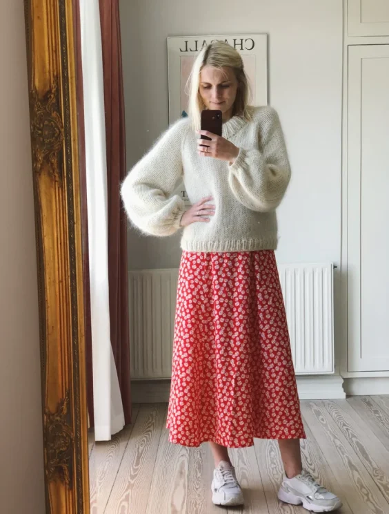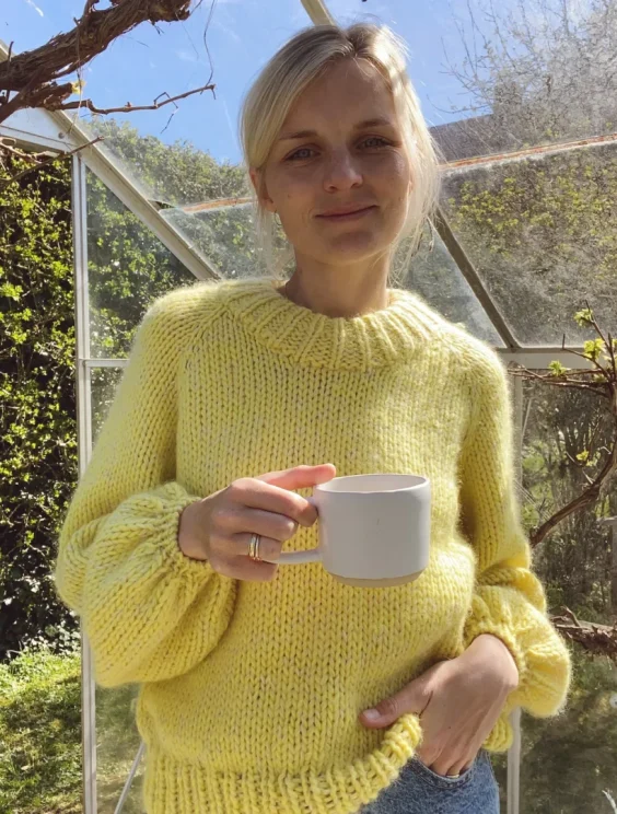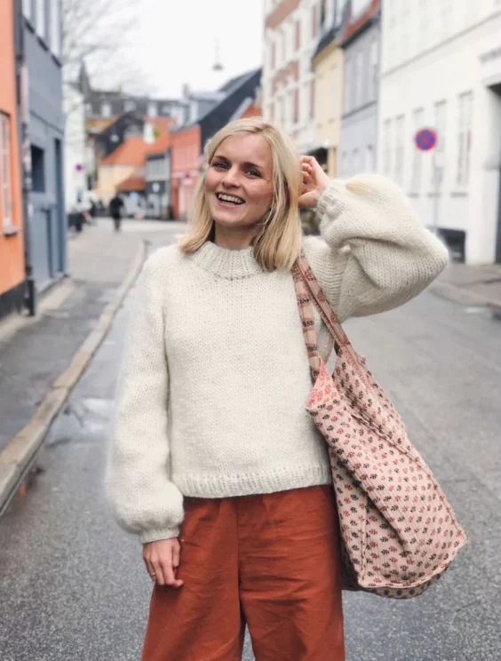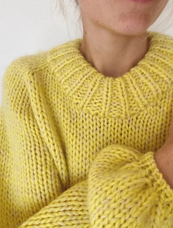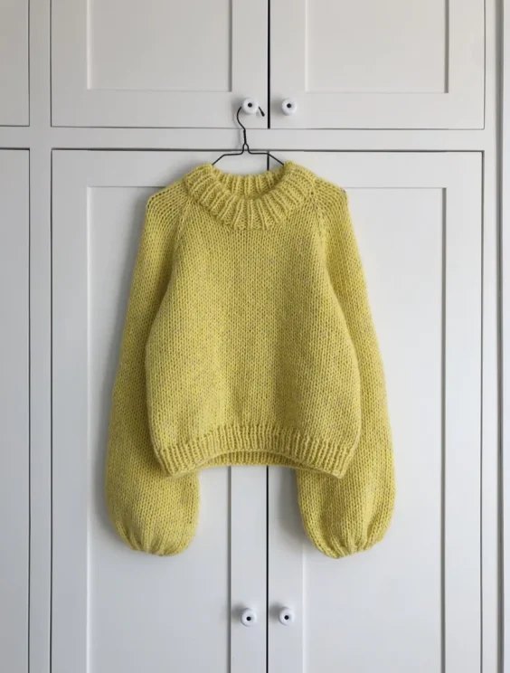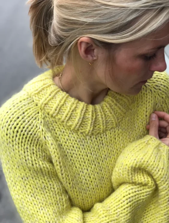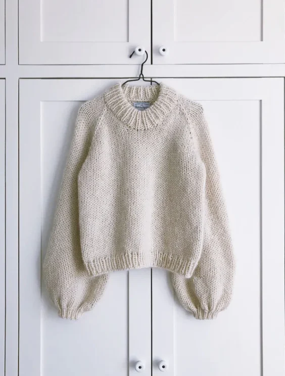 Holiday Sweater strikkes ovenfra og ned med raglanøkninger. Halsutskjæringen dannes ved at det først strikkes frem og tilbake på p med økninger i hver side, og deretter rundt på rundpinnen. Ermene har ekstra vidde ned mot håndleddet og avsluttes med en tettsittende vrangbordkant. Ermene strikkes rundt med Magic Loop-teknikk. Halsens vrangbordkant strikkes ut fra opplukkede m i halsåpningen. Det strikkes fellinger og økninger slik at halskanten legger seg pent ned mot halsen.