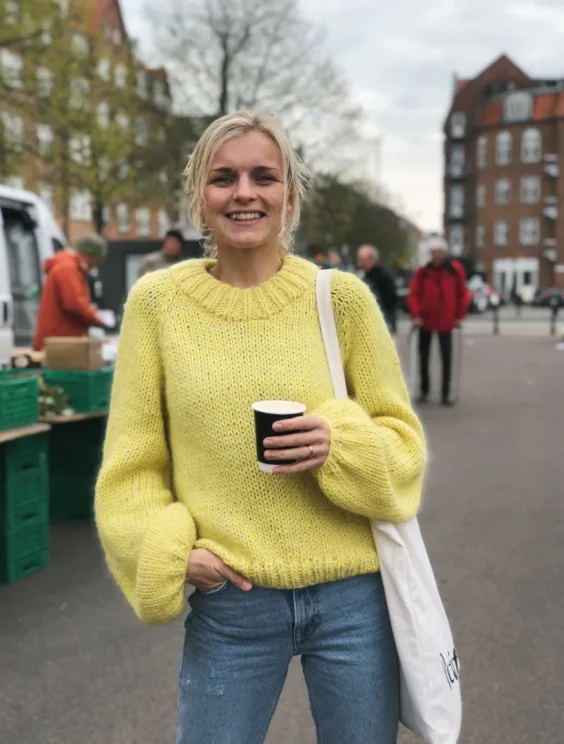 Forslag 2: 400 (400) 400 (450) 550g HipWool fra HipKnitShop (50 g = 80 m) sammen med 150 (150) 150 (175) 200 g dobbel tråd Angel fra Permin (25 g = 210 m) eller dobbel tråd Brushed Lace fra Mohair By Canard (25 g = 210 m) (garnforbruket angir det totale garnforbruket)